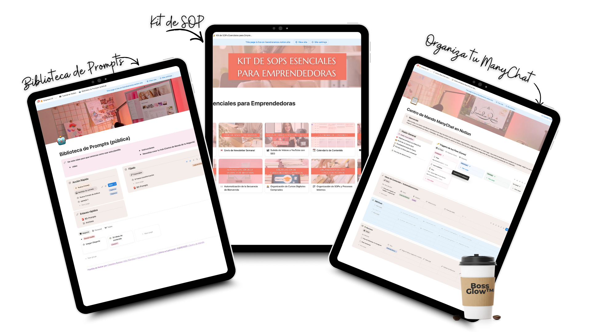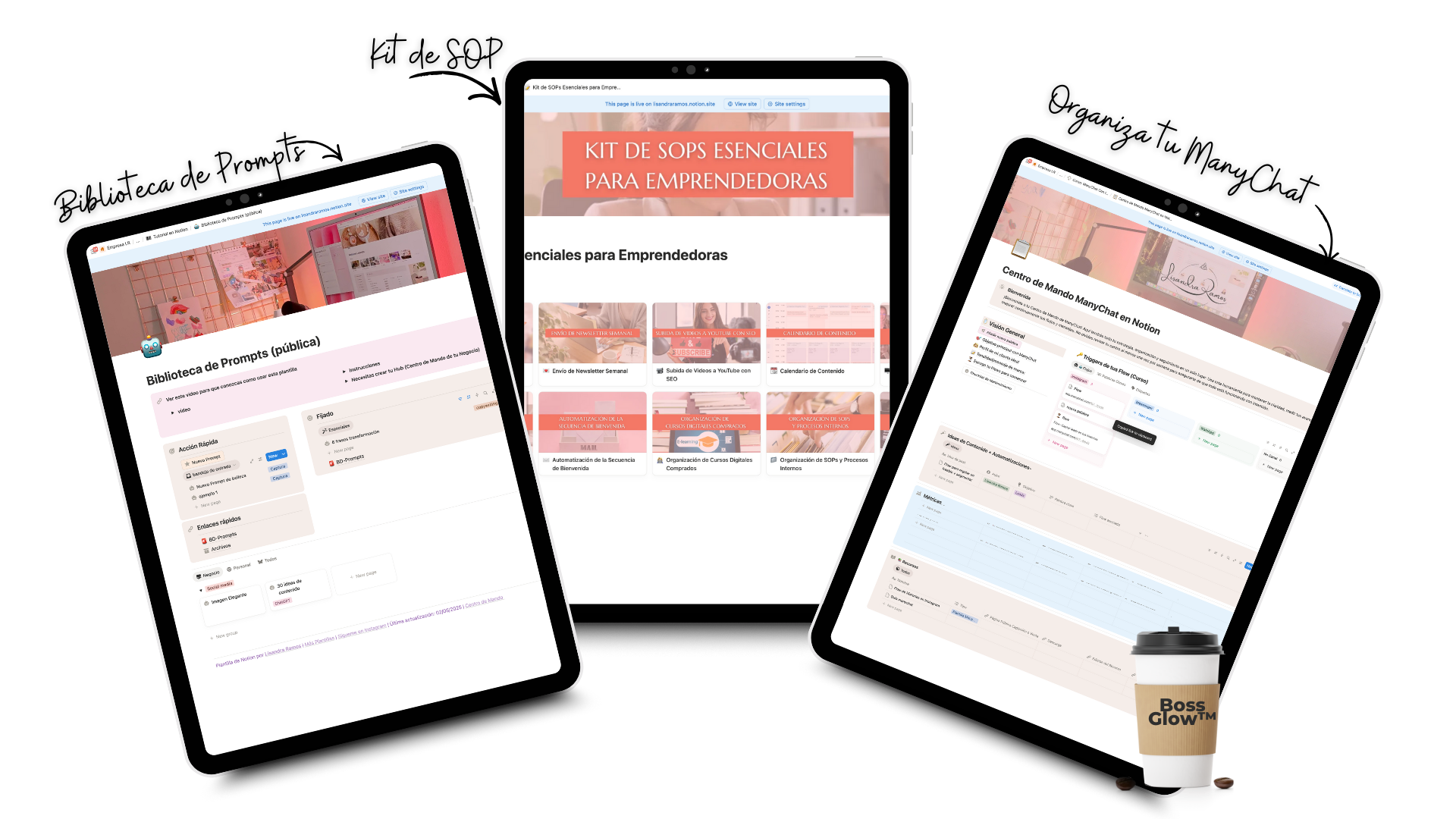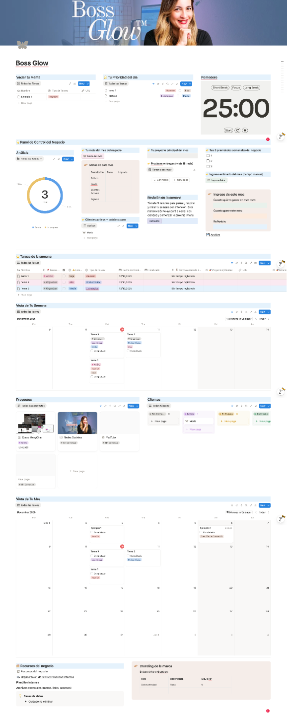 El Boss Glow™ es la plantilla lista para usar más vendida y recomendada por emprendedoras que trabajan desde casa y necesitan claridad inmediata, estructura y paz mental para tomar control de su negocio… sin sentirse abrumadas ni pasar horas aprendiendo Notion.