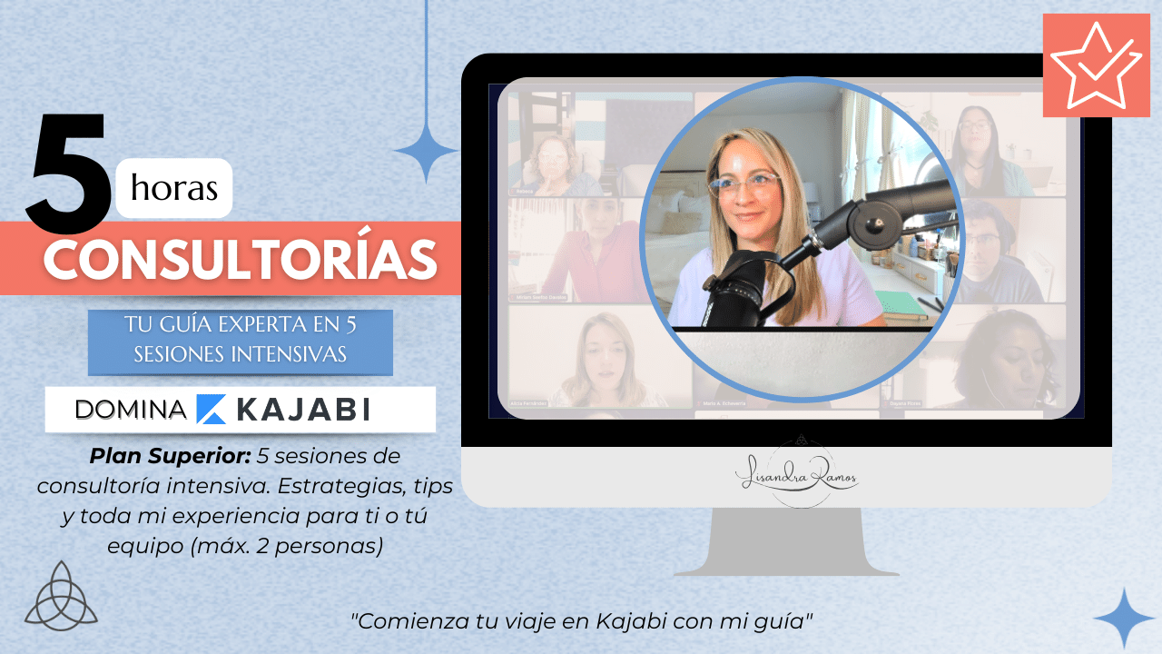 Embárcate en un viaje de cinco sesiones interactivas diseñadas específicamente para optimizar y fortalecer tu presencia en la plataforma Kajabi. Ya sea que busques afinar tus estrategias, idear soluciones innovadoras, configurar funnels eficientes u ordenar tu contenido, estoy aquí para ayudarte a aprovechar al máximo Kajabi.